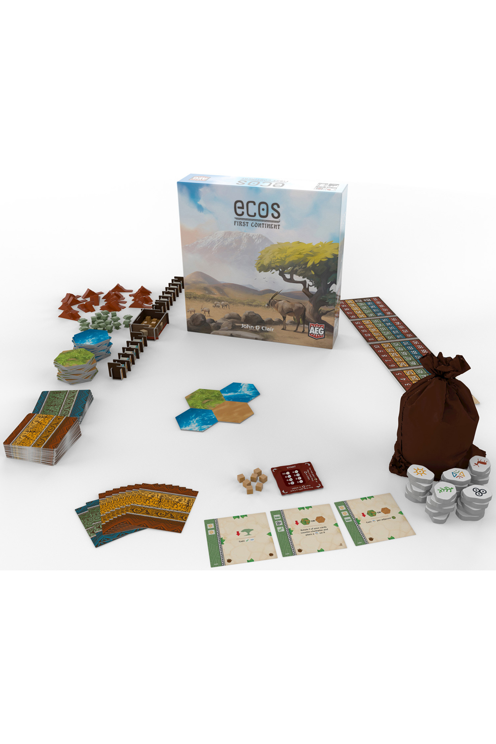 What if the formation of Earth had gone differently? In Ecos: First Continent, players are forces of nature molding the planet, but with competing visions of its grandeur. You have the chance to create a part of the world, similar but different to the one we know. Which landscapes, habitats, and species thrive will be up to you. Game play in Ecos is simultaneous. Each round, one player reveals element tokens from the element bag, giving all players the opportunity to complete a card from their tableau and shape the continent to their own purpose. Elements that cannot be used can be converted into energy cubes, additional cards in hand, or to add cards already in hand to your tableau, giving you greater options as the game evolves. Mountain ranges, jungle, rivers, seas, islands and savanna, each with their own fauna, all lie within the scope of the players' options. Game contains: 1 Rulebook, 6 Dial Tokens, 75 Map Tiles, 15 Wooden Mountain Tokens, 25 Wooden Forest Tokens, 66 Wooden Energy Cubes, 6 Wooden Scoring Cubes, 1 Score Board, 105 Game Cards, 102 Animal Tokens, 3 Storage Containers, 40 Wooden Element Tokens, 1 Element Bag