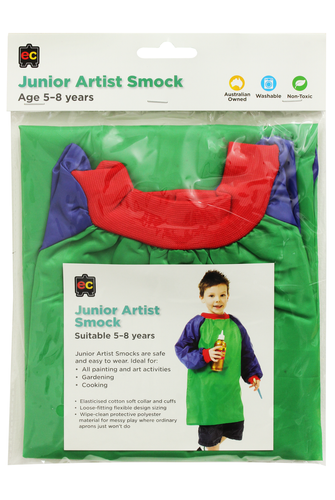A wipe-clean, protective polyester junior smock for messy play where an ordinary apron just won't do! Ideal for painting and art activities, gardening, and cooking. Features elasticised cotton cuffs and collar that are gentle on the skin, and an open-back, loose-fitting design. Designed for ages 5 - 8.
