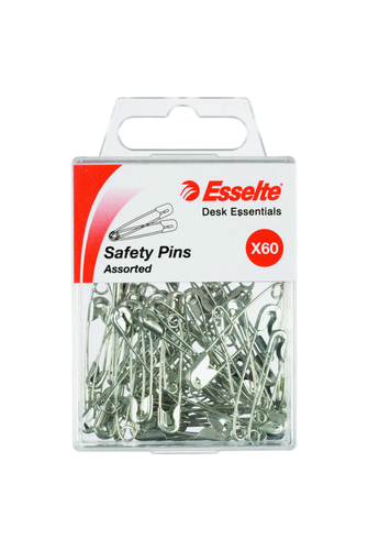 A pack of 60 Esselte metal safety pins in three sizes: 20 pins 28mm in length, 20 pins 32mm in length, 20 pins 38mm in length.