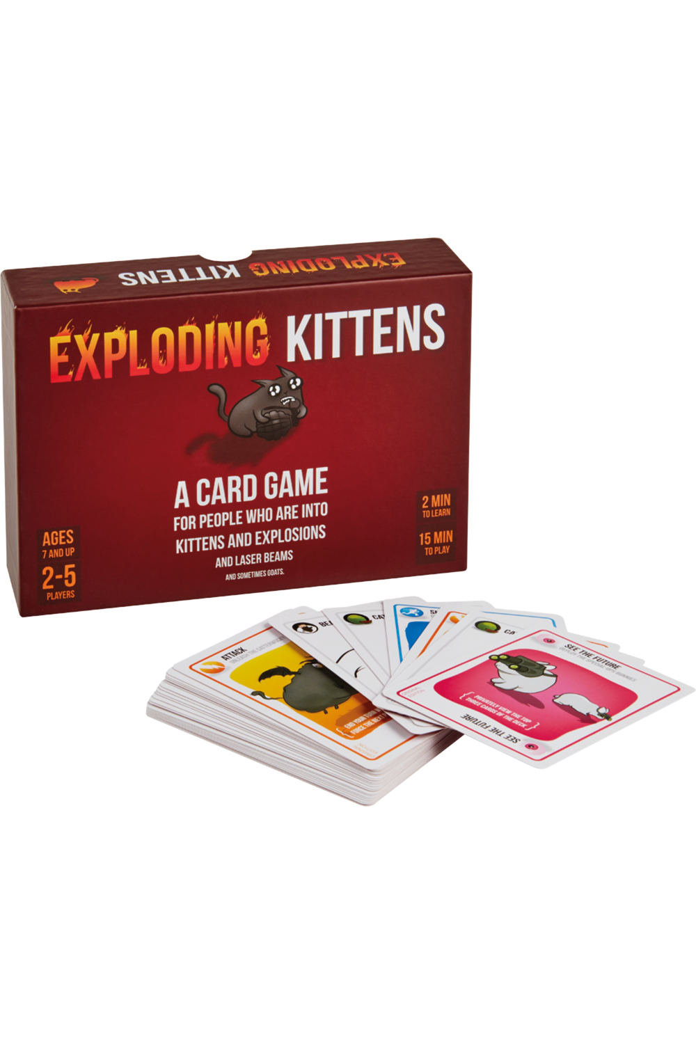 A card game for people who are into kittens and explosions. And laser beams. And sometimes goats. The game is highly-strategic, kitty-powered version of Russian Roulette. Players draw cards until someone draws an Exploding Kitten, at which point they explode, they are dead, and they are out of the game - unless that player has a Defuse card, which can defuse the Kitten using things like laser pointers, belly rubs, and catnip sandwiches. All of the other cards in the deck are used to move, mitigate, or avoid the Exploding Kittens.