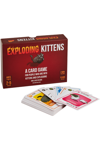 A card game for people who are into kittens and explosions. And laser beams. And sometimes goats. The game is highly-strategic, kitty-powered version of Russian Roulette. Players draw cards until someone draws an Exploding Kitten, at which point they explode, they are dead, and they are out of the game - unless that player has a Defuse card, which can defuse the Kitten using things like laser pointers, belly rubs, and catnip sandwiches. All of the other cards in the deck are used to move, mitigate, or avoid the Exploding Kittens.- Ages 7+