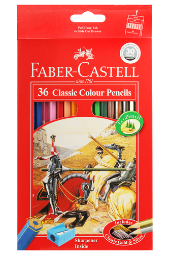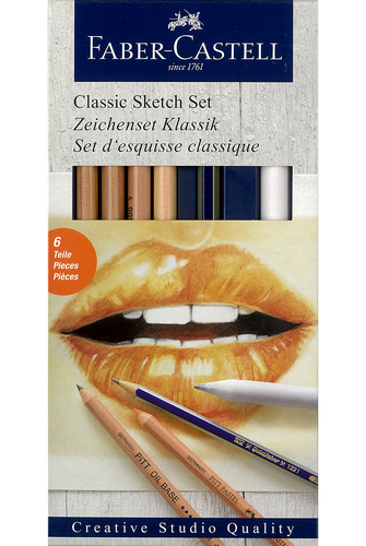 A classic sketch set from Faber-Castell featuring 1 Goldfaber sketch 2B pencil, 3 Pitt pastel pencils (in white medium, sanguine, and walnut brown), 1 Pitt oil base pencil (in black medium), and 1 blending stump.