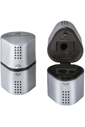 The Faber Grip Sharpener is a multi-purpose sharpener suitable for both colouring pencils and regular pencils. The hinged sharpener opens to reveal three different holes. The top hole is for colouring pencils and sharpens to a 'blunted' point. The two bottom holes are for regular and large size pencils and sharpen to a needle point. Each end of the sharpener has a handy compartment for holding the shavings which can be easily emptied.- Not suitable for children under 3 years.