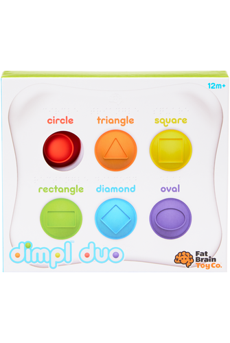 Textures, colours, shapes, and words! On one side, each silicone button is embossed with a different shape and labelled with its matching word in English and in Braille. Flip the whole thing over and this time, the buttons are smooth and the words match the colours! It's a tactile delight to touch, push, and pop. Its compact size is perfect for on-the-go. BPA-Free, made with food-grade silicone buttons, and designed just right for little hands, the Dimpl Duo is an ideal way to get the most out of sensory play. The Fat Brain Dimpl Duo Features: Unique tablet featuring silicone buttons, textured shapes, and words written in Braille; Encourages sensory exploration, tactile learning, shape learning, colour learning, reading skills; A beautifully tactile early learning experience; On one side, buttons embossed with shapes, labelled with shape names in English and Braille; Other side - Buttons are smooth, colours labelled in English and Braille; Buttons are a delight to feel, push, and pop.