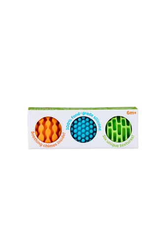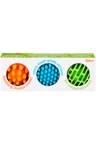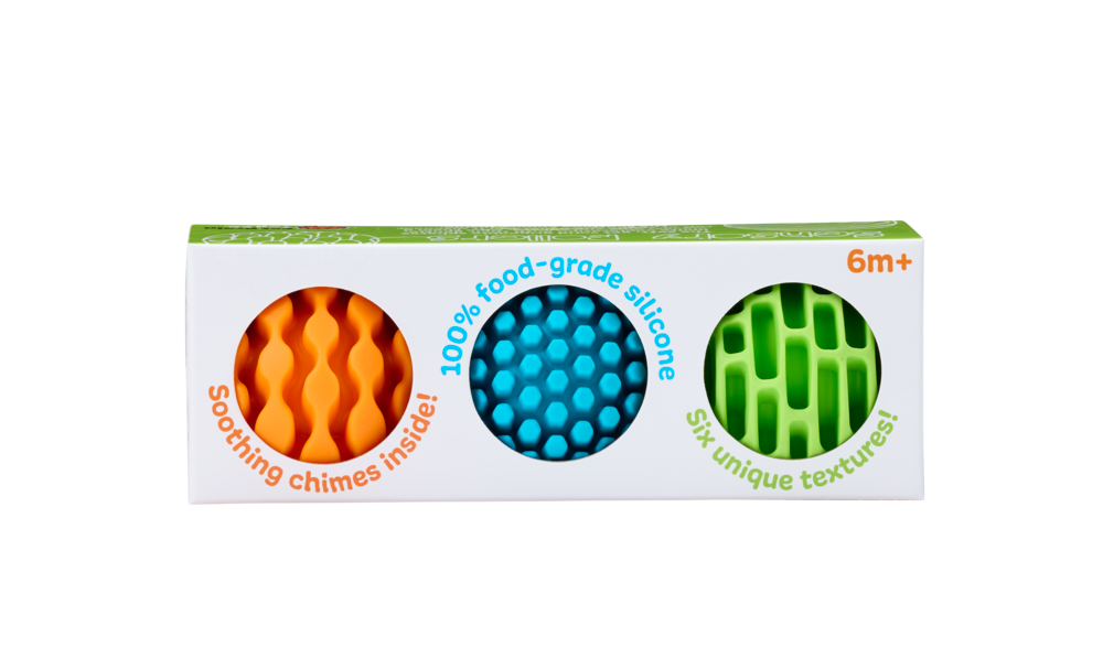 Roll, bounce, toss, and discover! Each of these three, high-quality silicone spheres features a unique design that mesmerizes the eyes and captures the imagination. Hands of all ages reflexively reach, grab, and explore their fascinating, rubbery textures before inevitably rolling them along a table or floor and when they do ears perk up. Minds are soothed yet excited. Curiosity and wonder unravel as the charming chimes hidden inside sing beautifully with each and every movement. Enliven your child's playtime expeditions with the cleverly captivating Sensory Rollers.