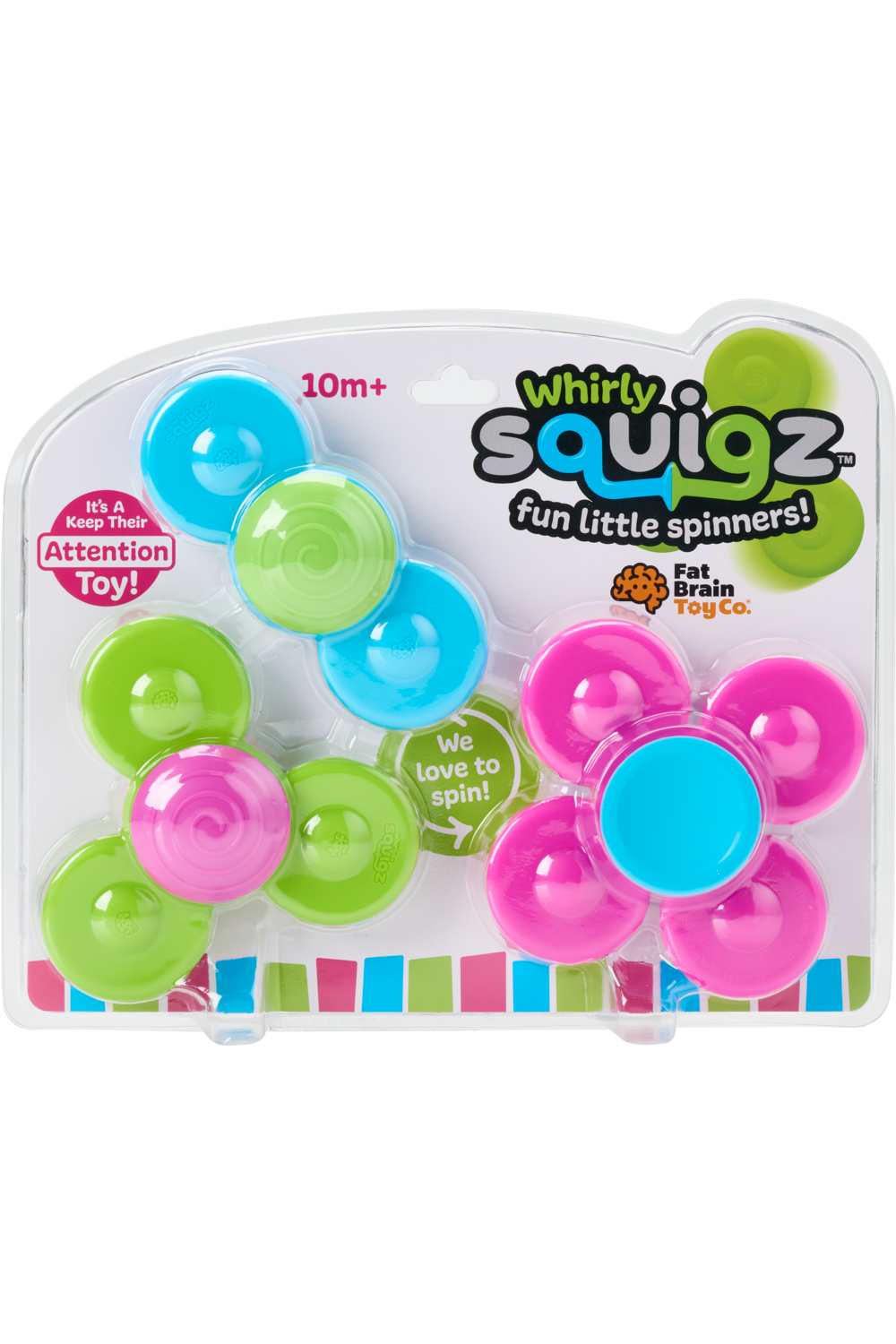 Whirly Squigz are big, bright, and full of tactile fun! Hold them, explore their contours, chomp on them and let them soothe sore gums. Then, stick them to any smooth, non-porous surface and give them a spin. WHOOSH! - Around and around they go, faster than the eye can see! Sensory exploration spins in a new direction