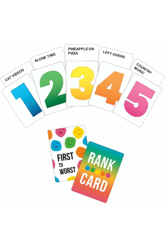 First to Worst is the ultimate multi-generational game of polarizing priorities! In this fun collaborative game, players try to get into each others' heads by guessing how fellow players rank a wide variety of interesting topics. Pineapple on Pizza? Country Music? Cat Videos? There are almost 300 topics in the game! The Ranker secretly ranks five random things from 1 to 5. Then, as a team, the rest of the players now try to guess the exact order chosen by The Ranker. Get more right than wrong to WIN the game!
