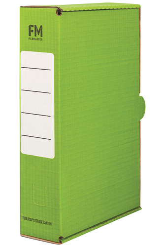 The File Master foolscap coloured storage box sets the bench mark for efficient and cost effective storage and is ideal for all forms of paper and file storage. The boxes are supplied flat and easy to assemble, with a printed panel on the spine for describing box content. Features large writing panel and a finger hole. Box comes in black but also available in red, green, yellow, blue, and kraft. Only available in store, not available online.- Size: Foolscap