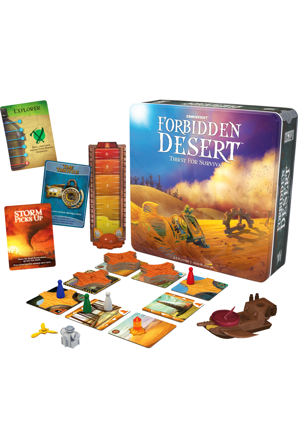 Gear up for a thrilling adventure to recover a legendary flying machine buried deep in the ruins of an ancient desert city. You'll need to coordinate with your teammates and use every available resource if you hope to survive the scorching heat and relentless sandstorm. Find the flying machine and escape before you all become permanent artifacts of the forbidden desert! In Forbidden Desert, a thematic sequel to Forbidden Island, players take on the roles of brave adventurers who must throw caution to the wind and survive both blistering heat and blustering sand in order to recover a legendary flying machine buried under an ancient desert city. While featuring cooperative gameplay similar to Forbidden Island, Forbidden Desert is a fresh, new game based around an innovative set of mechanisms such as an ever-shifting board, individual resource management, and a unique method for locating the flying machine parts.