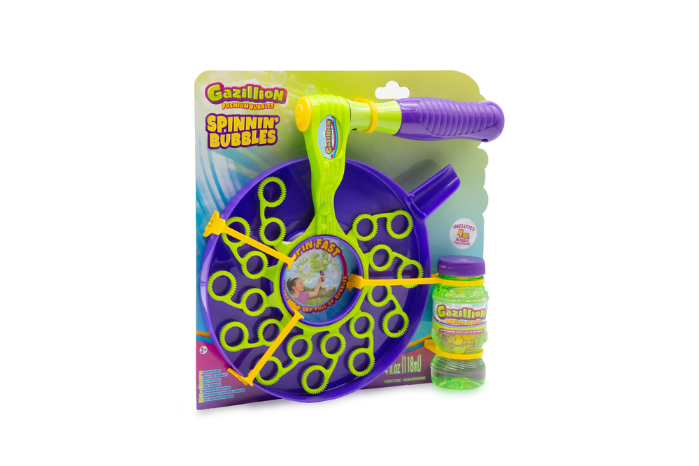 Instantly create a sky full of bubbles with Gazillion Bubbles Spinnin' Bubbles Wand! Dip the wand into the Gazillion Bubbles solution and spin the wand to make a flurry of bubbles in a flash! This wand comes with its own no-spill tray and 4 ounce bottle of Gazillion Bubbles Solution. Simply pour the solution into the provided tray, dip the wand into the solution, and give it a spin to create lots and lots of bubbles!