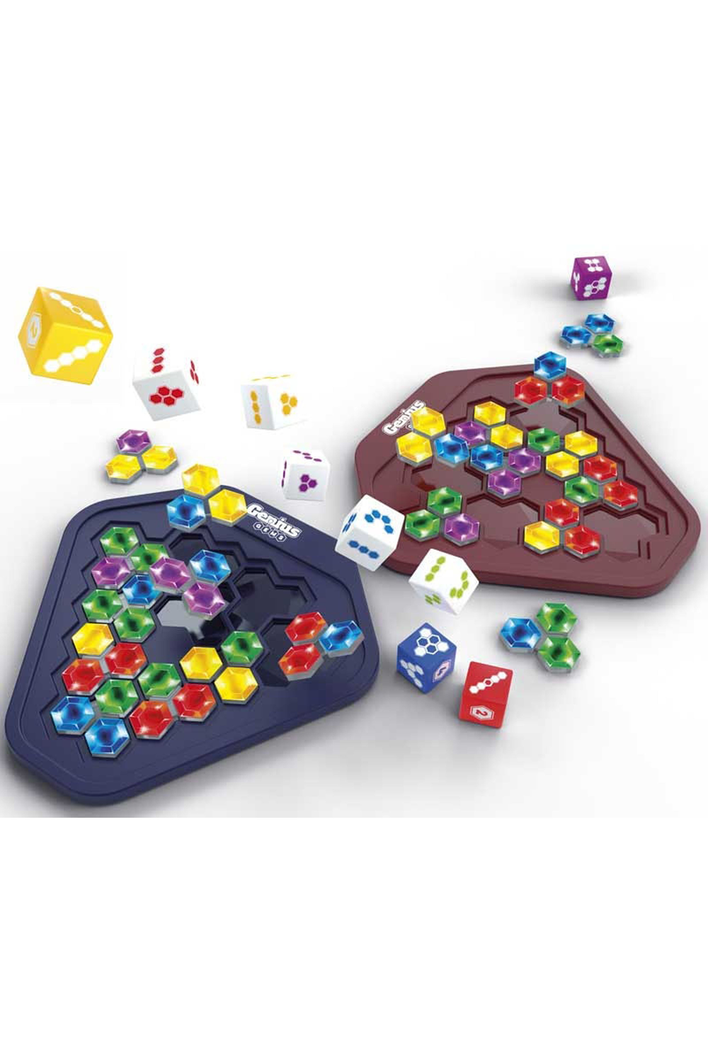 Genius Gems challenges players to race their opponent and be the first to fill the gameboard with the colourful jewel puzzle pieces. But that's not all! Genius Gems offers five levels of play, with each level becoming more challenging. Players can simply play the starter level... or race through all five levels. The first to solve the Wizard level is the winner! With over 10,000 puzzle combinations possible, Genius Gems provides endless, fast-paced strategic fun.