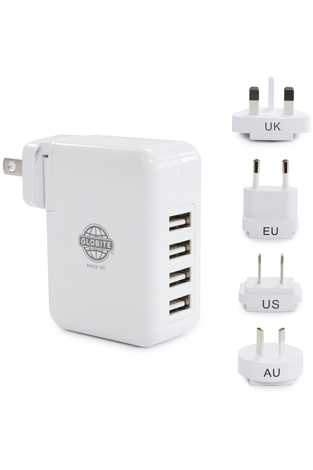 Make charging overseas a breeze with the 4-Port USB Travel Charger. Charge your phone, iPad, tablet and camera all at once with the Globite 4 Port USB Charger. This super fast charging hub is perfect for family vacations when the entire tribe needs to power up at once. Light weight design is easily portable and includes 4 country plugs and can be used in Australia, EU, USA, and UK. Features: Charge up to 4 devices at once, plugs in to wall, quick charging, lightweight and compact design. Input: AC100-240V 50/60Hz, O.6A. Output: DC5V, Max 4.2A SAA-171180-EA. Plugs: Type A, Type C, Type G, Type I. NOTE: Travel adaptors do not convert voltage or frequency. Check voltage requirement of appliance before use. If the supply voltage and the voltage required for your appliance differ then use an appropriate transformer, or check if your appliance has a variable voltage section.