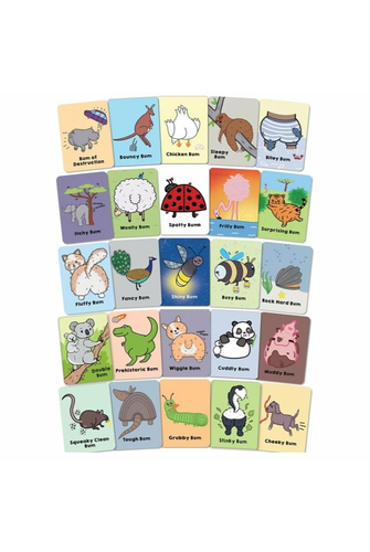 Do you have an Bouncy Bum? Do you have a Fluffy Bum? It's the cheeky version of Go Fish where you match different kinds of animal bums to win! This quick to learn and easy to play game features 25 family friendly but super cheeky bums to match, with optional rules that add even more laugh out loud fun like: Wiggle Bum: wiggle your bum when you get the Wiggle Bum match - Double Bum: take another turn when you get the Double Bum match - Golden Bum: get 2 points at the end of the game with the Golden Bum match