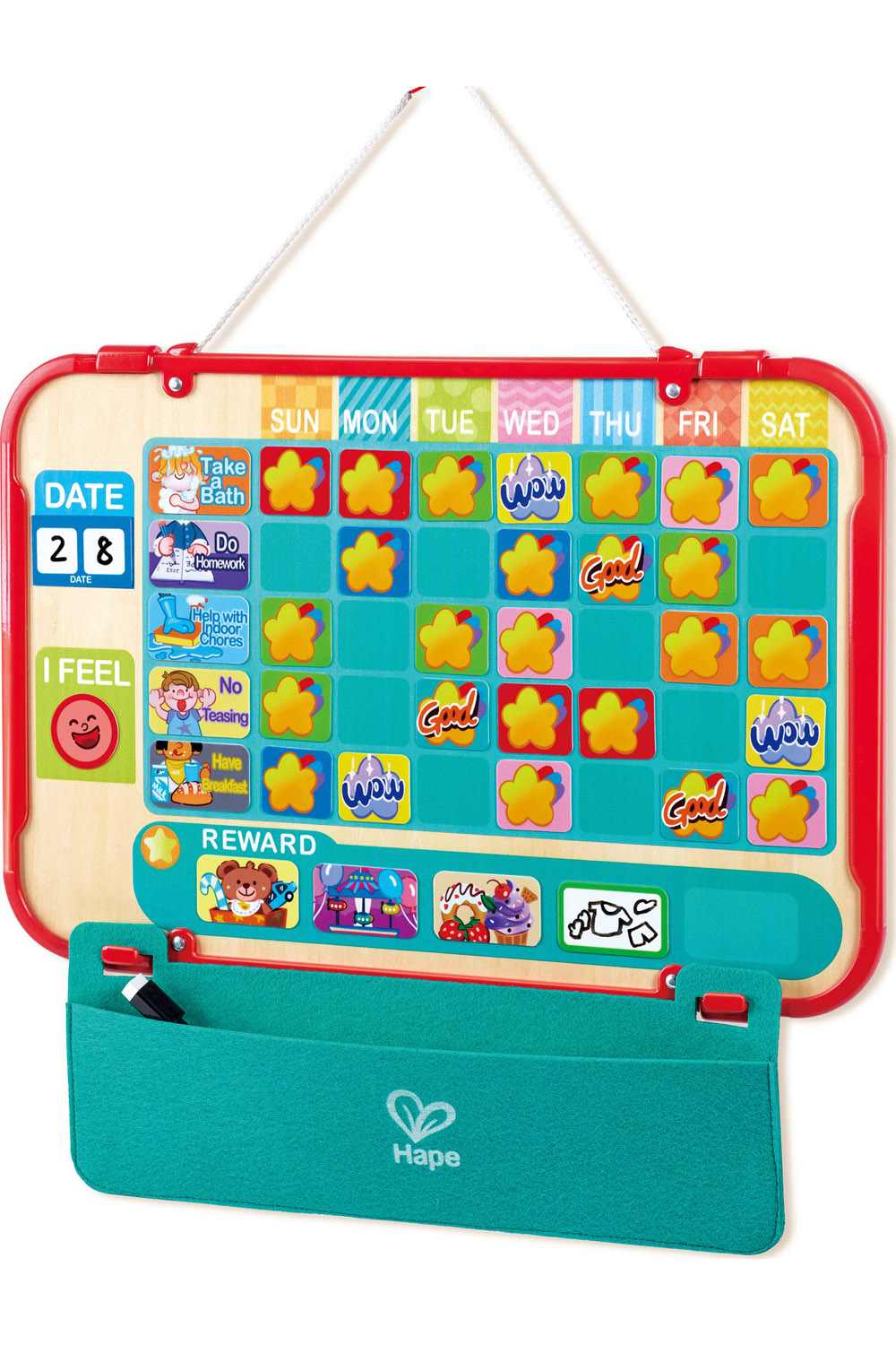Only available in-store, not available online. Use colourful stickers and personalized tasks to engage your child in their responsibilities. Celebrate each achievement with reward stickers, and don't forget to track their daily moods. Turn chores into an exciting adventure! This chart helps your child to organize their household chores all in one place, and they'll love seeing a visual representation of their work. This habit chart comes with a hanging bag that can be placed on the board for convenient storage of all the chore cards and stickers. The front wooden side lets your child set their daily or weekly plans and aids in their habit formation, while the back whiteboard allows them to plan for the month and year, promoting time management skills. Choose from a variety of chores like homework, pet care, teeth brushing, and more, or customize the chart by adding your child's unique chores and tasks. Children can create their own tasks with 10 reusable blank stickers, stay motivated with 50 reward stickers, and track their moods using 5 emotional stickers for a complete and personalized experience. With magnetic functionality, your child can effortlessly place all the stickers on the board, making it a fun and interactive experience. Plus, the whiteboard and pen allow children to write down their goals, plans or schedules, instilling positive planning habits.