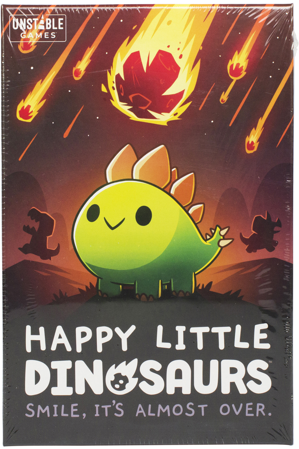 Lately, it feels like we're all just dinosaurs trying to avoid the falling meteors. In this game, you'll try to dodge all of life's little disasters. You might fall into a pit of hot lava or get ghosted by your dino date, but the dino who survives it all wins the game! In Happy Little Dinosaurs, the first person to reach 50 points, or be the last Dinosaur standing, wins the game! During each round, you'll flip a Disaster card featuring a Natural, Predatory, or Emotional disaster. Each player will play a Point card in hopes of collecting points and avoiding the disaster. You will work to avoid all of life's little disasters and laugh as they happen to your friends. If you collect 3 Disaster cards of the same type OR 3 different types of Disaster cards, you will be out of the game. Point cards feature weapons, trinkets, and good luck charms that you use to collect points and avoid disasters. Each card has a point value between 0 and 9 that you will use when scoring a round. You can use Instant cards at different points during the game to tip the odds in your favour or save your Dinosaur from certain death. Player boards include your Dinosaur's traits, an Escape Route you use to track your score, and a Disaster Area where you will collect Disaster cards. Player boards include your Dinosaur's traits, an Escape Route you use to track your score, and a Disaster Area where you will collect Disaster cards. You'll move your Dinosaur meeple along the Escape Route on your player board to track your score. Will you successfully dodge the disasters or get eaten by a prehistoric whale? Only the cards can decide.