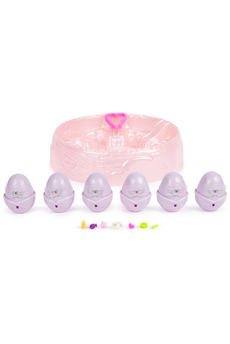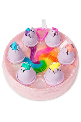 Bring the rainbow to life with the Hatchimals Alive Rainbow Hatchery! With your love and care, playful Rainbow Splash Hatchimals come to life in a colourful new way: eggs that hatch in water, changing the water's colour to match the character inside! The Rainbow Hatchery includes 6 characters in eggs, 6 pairs of wings, 6 nurturing accessories and a nest. To begin hatching, set the eggs in the nest and remove their wings, then slowly fill the heart with water. In seconds, the water will start to change colours, swirling into a mesmerizing rainbow while each character starts cracking through their eggs! Discover a playfully posed puppy, unicorn, penguin and more! Play inside the nest on the slide, have mealtime at the highchair and use the nurturing accessories like a pacifier, bowl and spoon, bottle and more for endless storytelling. Those who enjoy action figures, small toys, dolls, and doll house play will love Hatchimals surprise toys. Fun birthday gifts, Christmas gifts and stocking stuffers or gifts for any occasion. Hatch the rainbow with Hatchimals Alive Rainbow Hatchery!