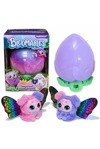 With an exciting double character reveal you can repeat, over 100 sounds and reactions and so many ways to play, Bloomables are a must-have. These magical flowers need your love to bloom. Nurture and shower the flower with the watering can accessory until it glows rainbow, then watch as the petals open, revealing an adorable Hatchipillar inside. Feed your new friend the leaf accessory, cuddle and play. When the antennae turn rainbow, it's ready to transform. Place your Hatchipillar back inside the flower and the petals close. Enjoy the colourful lights and music until your fluttery friend blooms - the petals open once again, revealing a transformed Puppyfly with colourful wings. Tickle her, sing songs together, tell fortunes by asking Puppyfly questions and so much more. Inside each Bloomables Puppyfly flower, discover 1 of 2 characters, Blossom or Daisy. For even more ways to play, kids can repeat the blooming and reveals again and again. Those who enjoy surprise toys, electronic pets, action figures, dolls, and doll house play will love Bloomables boys and girls toys.- Ages 5+