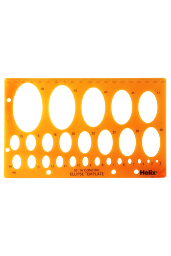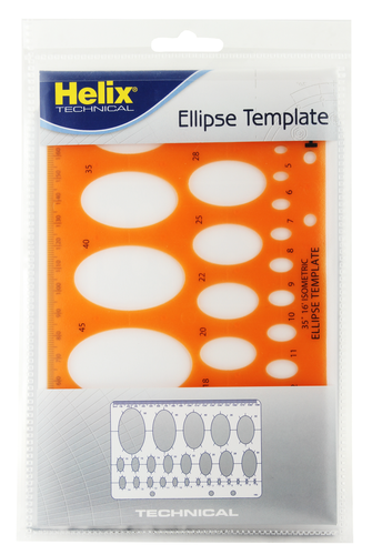 The Helix Ellipse Template is useful  tool for school, university, home or office. Has 26 marked ellipses  marked with dimensions 2 to 50mm. Template is marked in cms on one edge for convenience. Bevelled inner edges and ink risers on reverse side allow smudge-free use when tracing. Template is shatterproof, made from flexible translucent polypropylene. Matte finish to reduce glare. Has added feature of being hole punched to enable easy storage in a ringbinder or folder.