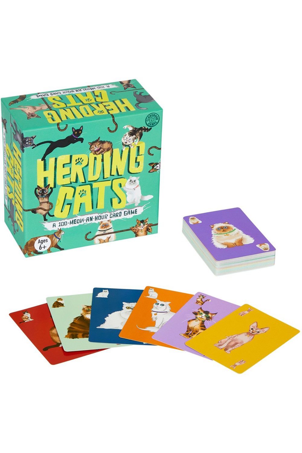 Felines are causing havoc! Race against your opponents to round up four-of-a-kind. But don't let the cat out the bag! Bring fun, excitement and lightning reflexes to your next gathering with Herding Cats, the fast-paced card grabbing game. Great for children and adults alike, Herding Cats will have you and your friends competing to snatch cat cards from the table in a wild race to win!