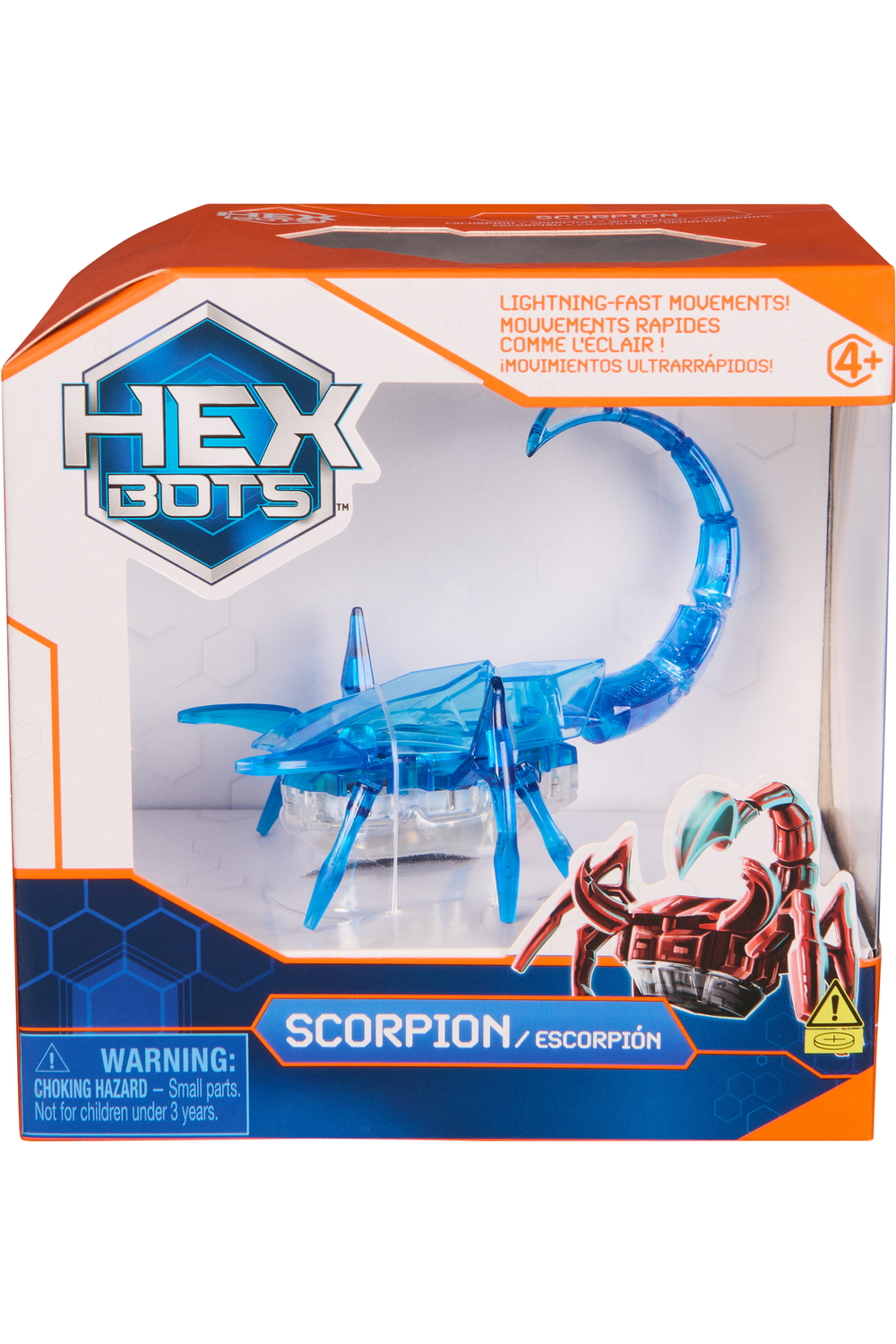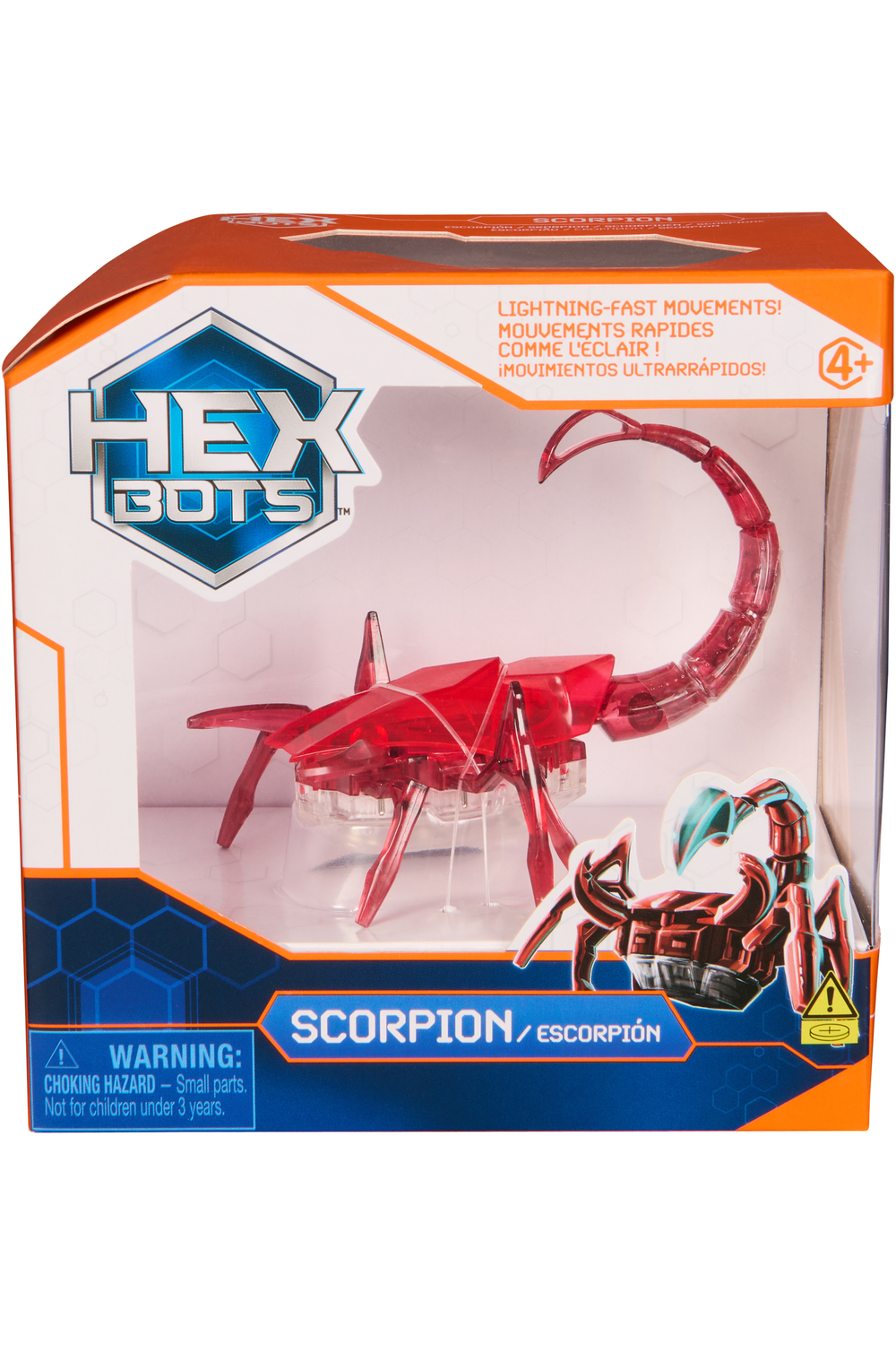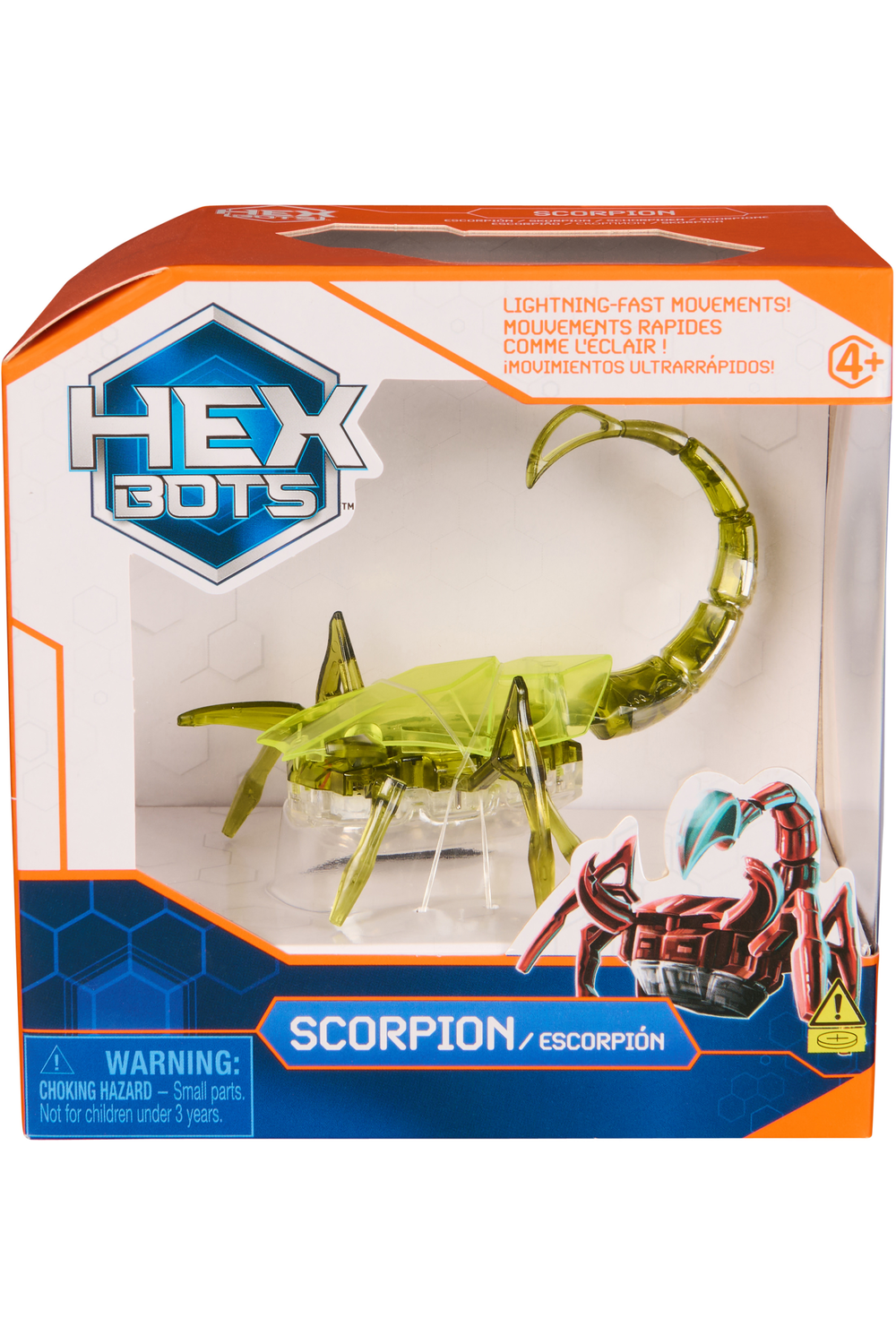 The HEX BOTS Scorpion is here with autonomous robotic creepy-crawly action! Watch as this crawling toy scutters across any surface and explores every nook and cranny completely on its own! With claws that ricochet off walls and objects, and a bobbing tail with a stinger, you and your friends will think this robotic scorpion is alive! HEX BOTS creatures are the perfect toys for children who love to build and play with robots!