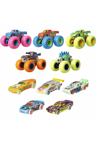With 10 vehicles together, this set of Hot Wheels Monster Trucks Glow in the Dark is an instant collection! Five die-cast monster trucks and five 1:64 scale die-cast cars provide endless smashing and crashing play - with the lights on or off! Glow-in-the-dark elements bring a new edge to "light speed." Kids can collect other Monster Trucks vehicles and toys for even more stunting, racing and battling play!
