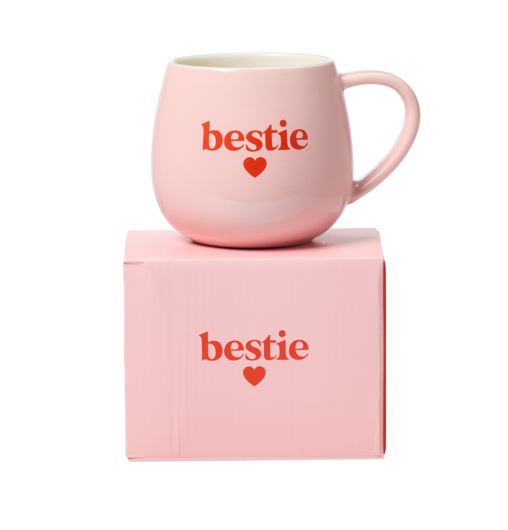 Whether you're a tea, coffee, or hot chocolate-drinker, you can enjoy a comforting cup of your favourite hot drink in this delightful hug mug featuring the word "Bestie" with a heart on a pink background. This Mug is dishwasher comes in a matching box for easy gifting or storage.