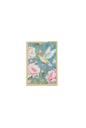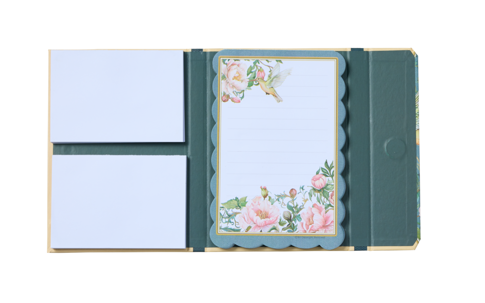 A shopping list notepad set featuring beautiful images of hummingbirds and vibrant florals on a magnetic hard cover. The set includes two blank notepads with tear-off pages and one printed notepad with tear-off pages. The printed pad is ruled with floral designs and scalloped edges, and measures 10cm x 15cm. The two blank pads measure 10cm x 7cm.