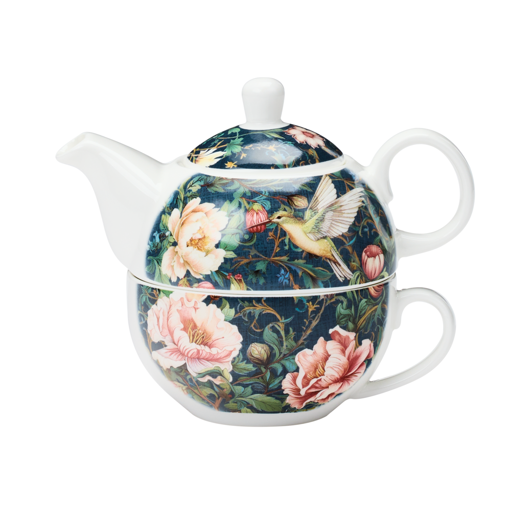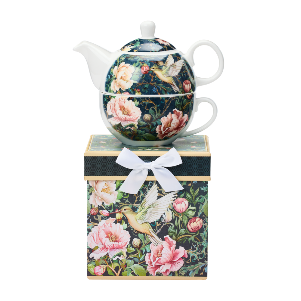 A tea-for-one set with beautiful images of hummingbirds and vibrant florals in a matching box for gifting and safekeeping. The set includes a small teapot with lid and a matching teacup. A beautiful gift for someone you care about or even just for yourself.