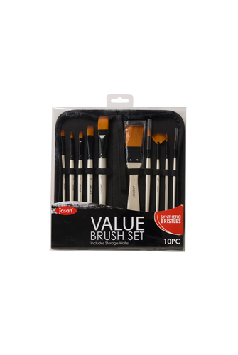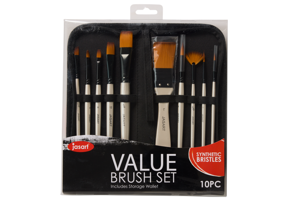 A pack of 10 Jasart paintbrushes with sophisticated pearl white handles and gold synthetic bristles. Perfect for use in acrylic, watercolour, and tempera painting. This assorted 10 pack of brushes is housed within a durable nylon wallet with secure zip closure.
