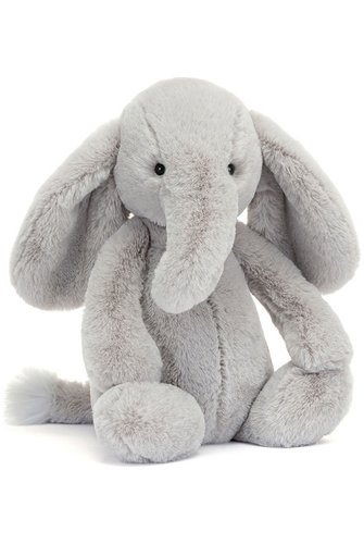 Bashful Luxe Elephant Thuddeus has a nose for adventure. In luxuriously soft grey fur with a fluffy tail tip, Thuddeus uses that long, curved trunk to sniff out new friends, and those big ears to listen to exciting stories. What adventures will you seek out together?- Ages 0+