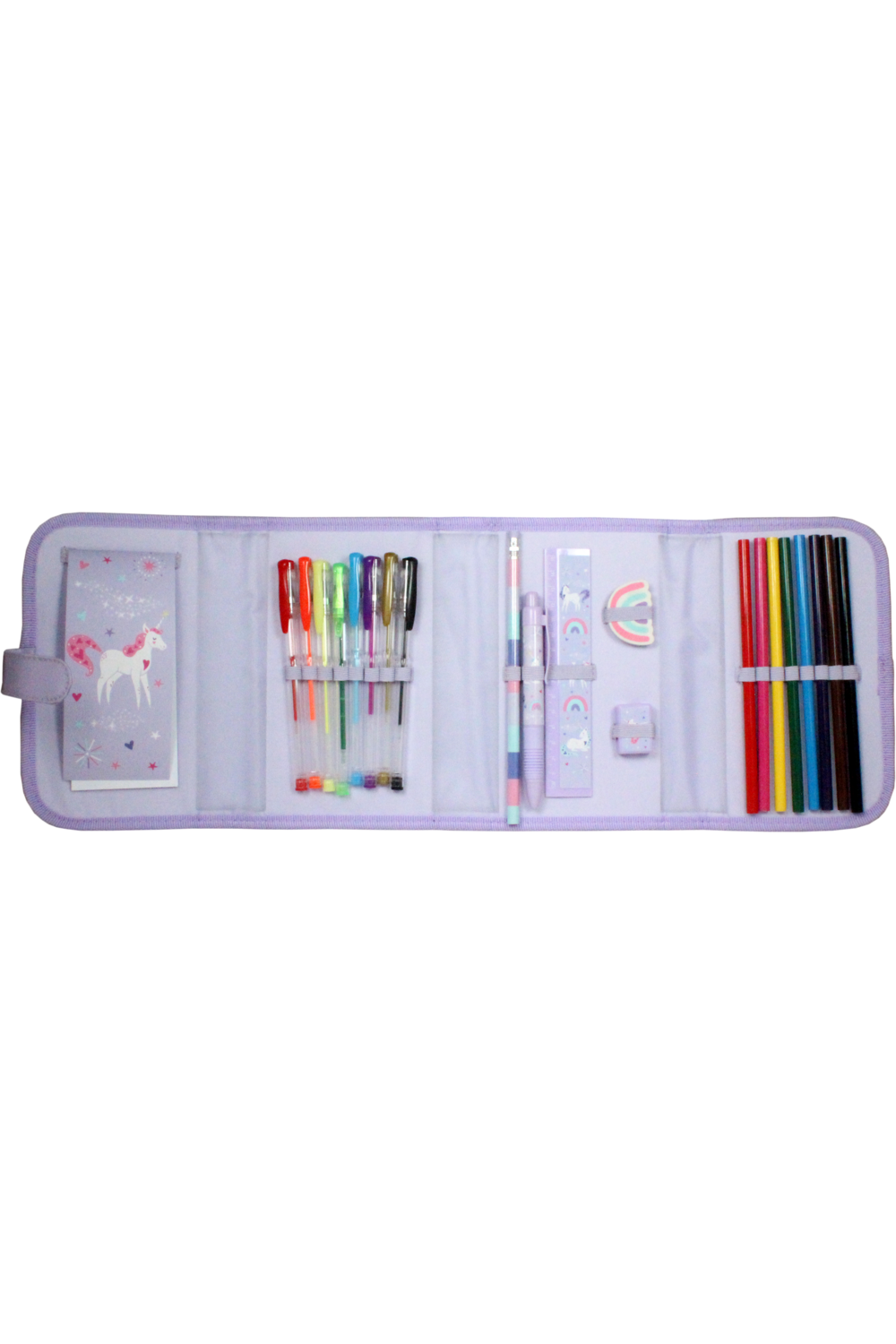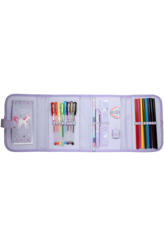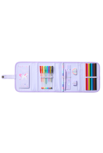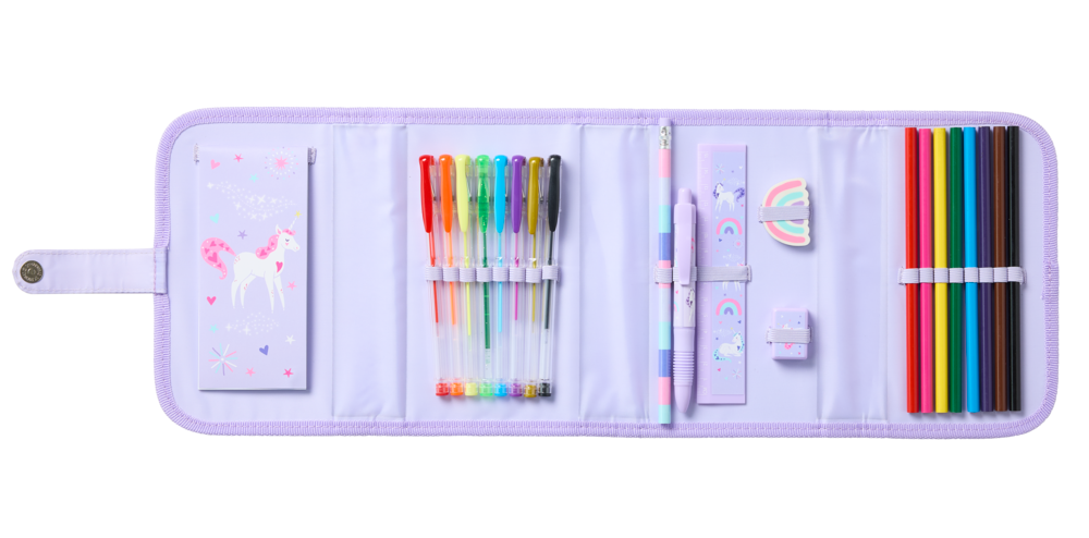 Take all of your school supplies on the go with this adorable filled pencil case from the Jotz Unicorn range. The case secures with a magnet dome and opens up to reveal a notepad, 8 fibre tip pens, 8 colouring pencils, an HB pencil, a ballpen, a ruler, an eraser, and a sharpener.