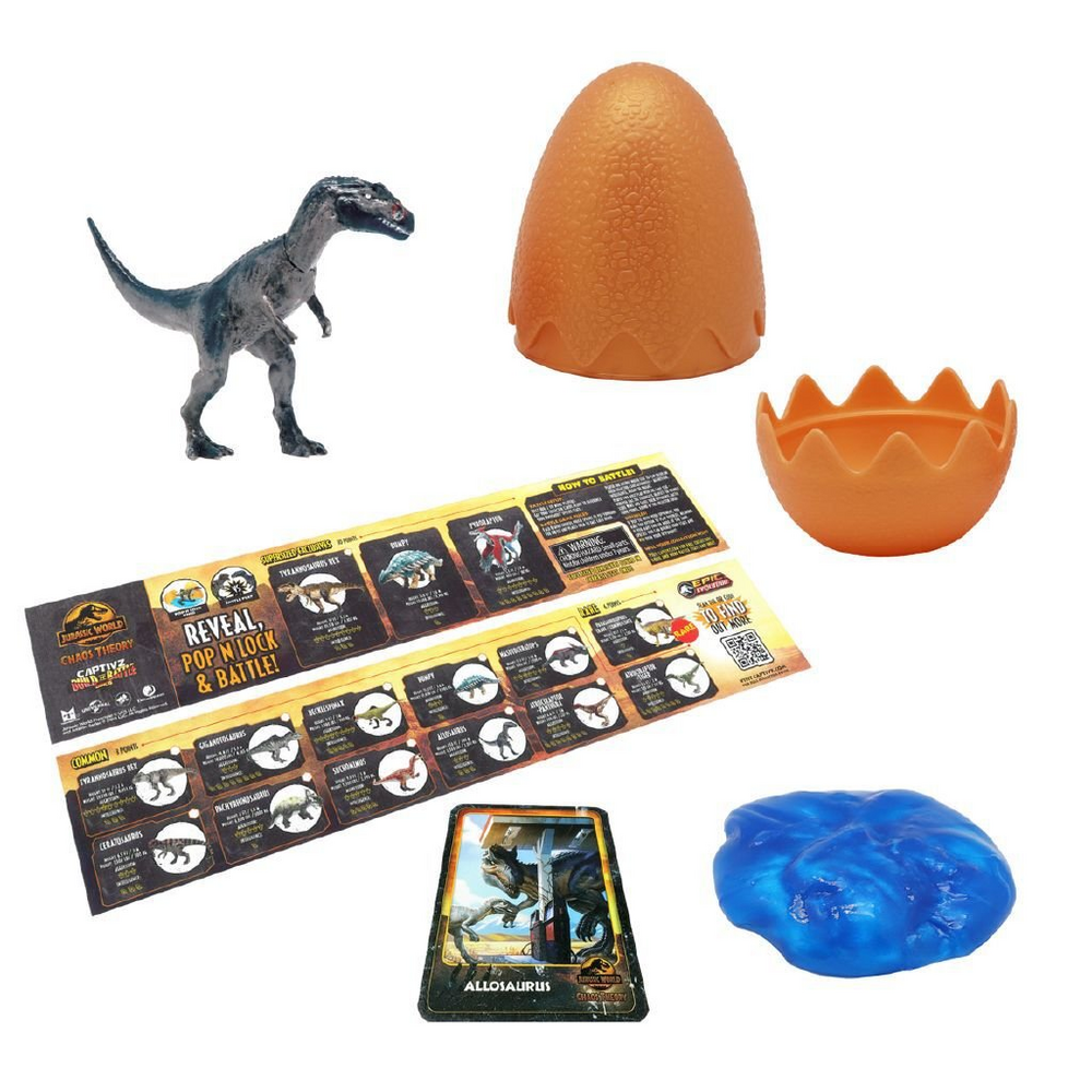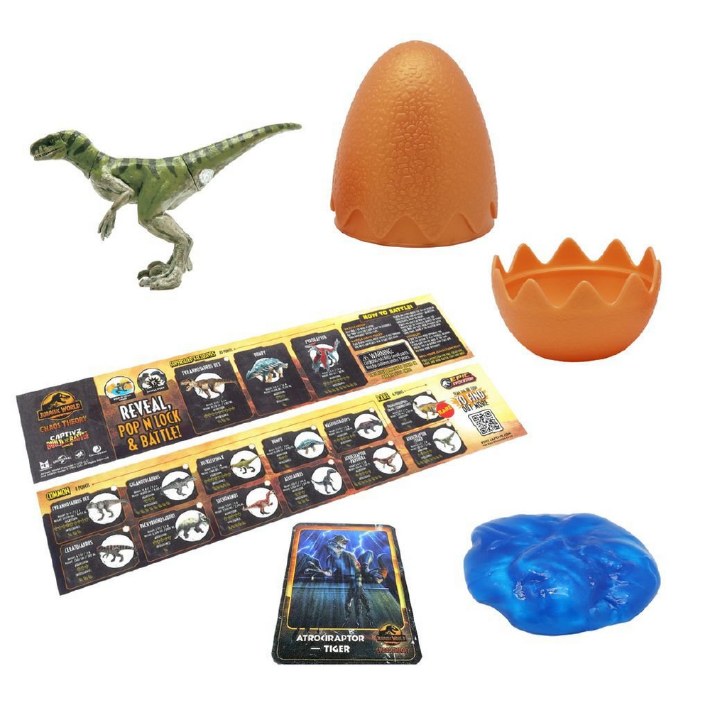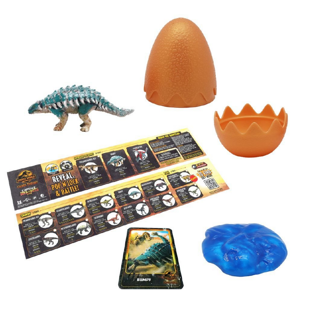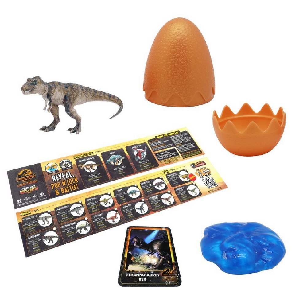 A new era of Chaos begins with Jurassic World Chaos Theory CAPTIVZ. Crack your egg to reveal blue Biosyn slime and a Chaos Theory POP N LOCK dino. With 12 to collect, will you find them all? Including the RARE bioluminescent Parasaurolophus.