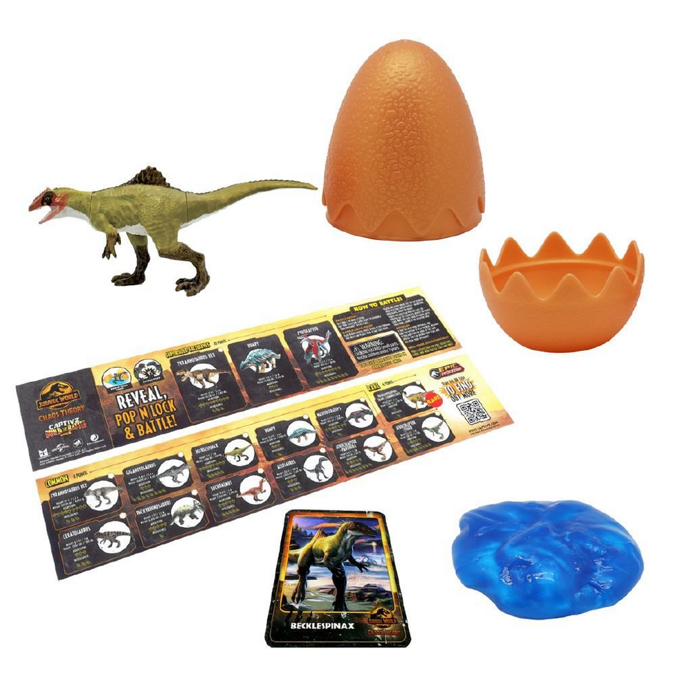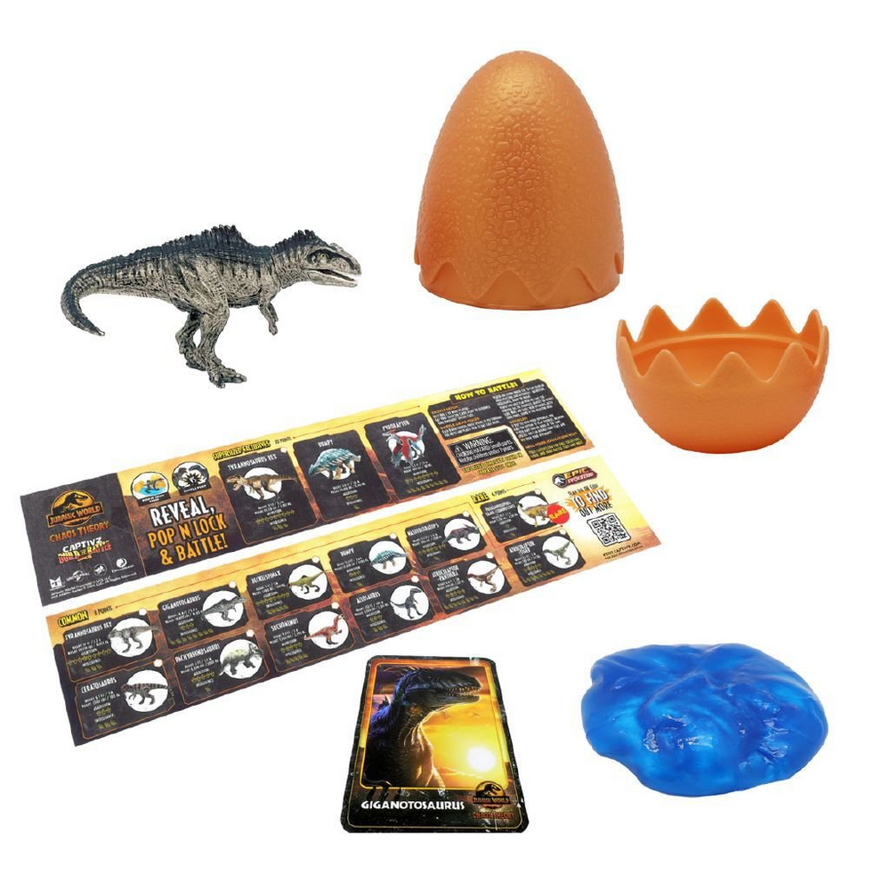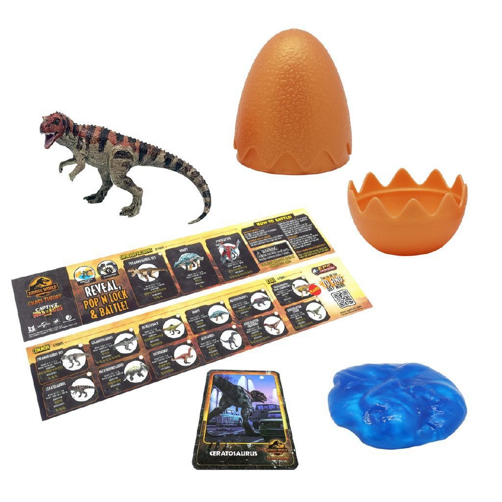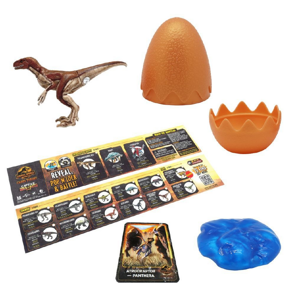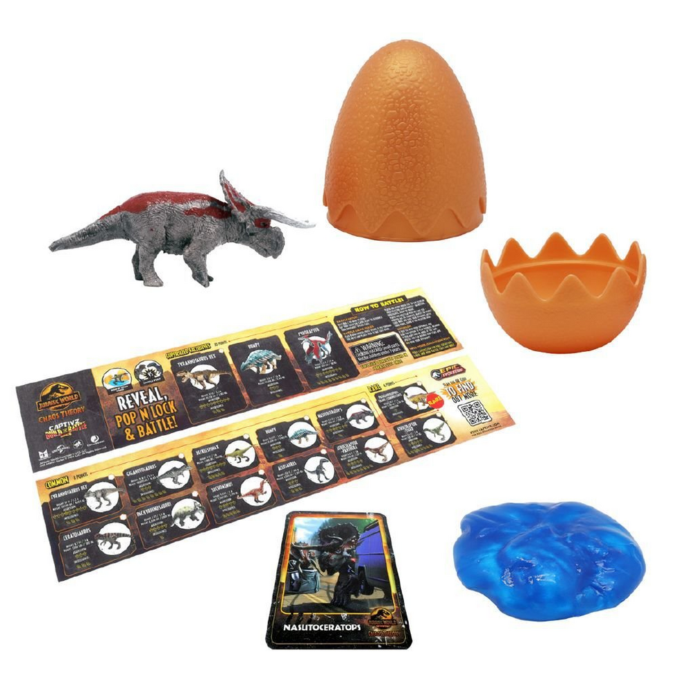 A new era of Chaos begins with Jurassic World Chaos Theory CAPTIVZ. Crack your egg to reveal blue Biosyn slime and a Chaos Theory POP N LOCK dino. With 12 to collect, will you find them all? Including the RARE bioluminescent Parasaurolophus.