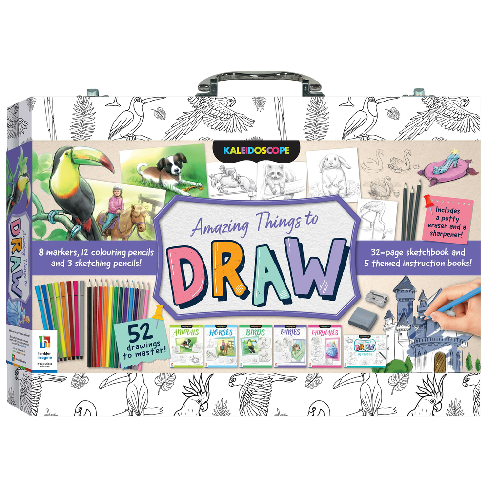 Grab your pencils and get ready for a drawing adventure with Kaleidoscope Amazing Things to Draw Carry Case! This awesome set comes with five fun instruction books to help you master everything from fairies and princesses to cool animals and more. With heaps of colourful stationery including pencils and markers, you'll have everything you need to bring your creations to life. Whether you're just starting out or a doodling pro, this carry case is packed with endless drawing fun!