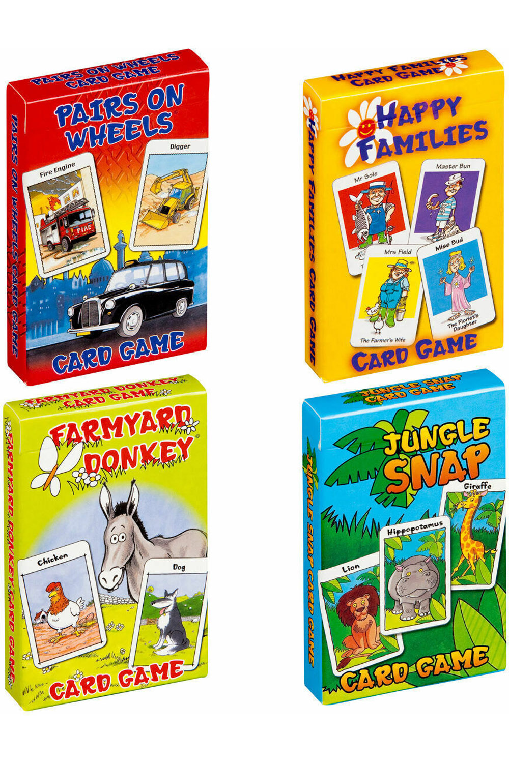 Have fun with one of four classical family card games illustrated with humourous caricatures. Each of these packs has brilliant colourful cards for any of the four games, Happy Families, Farmyard, Pairs on Wheels, or Snap. Please note each pack hold only one type of card game.