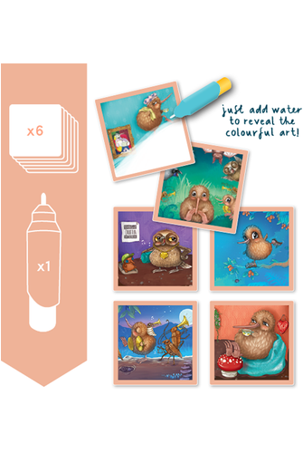 Designed for budding creatives, this compact activity set is bursting with fun. Simply fill the magic pen with water and watch as it unveils hidden pictures featuring scenes from the Kuwi the Kiwi books on the illustration boards. Once dry, the scenes disappear, allowing for endless painting fun! Plus, see the bonus puzzle on the back of the cards. Crafted with care, these premium activity sets are tailor-made for mess-free, on-the-go play, making them perfect companions for travel, at cafes, or at home.