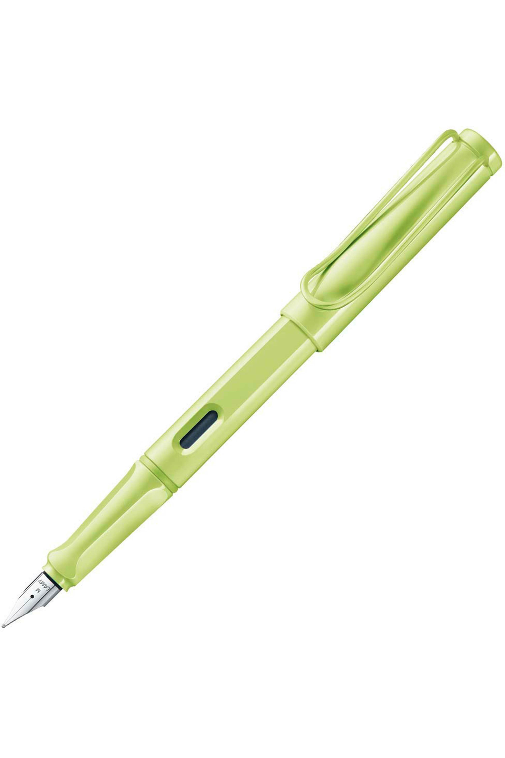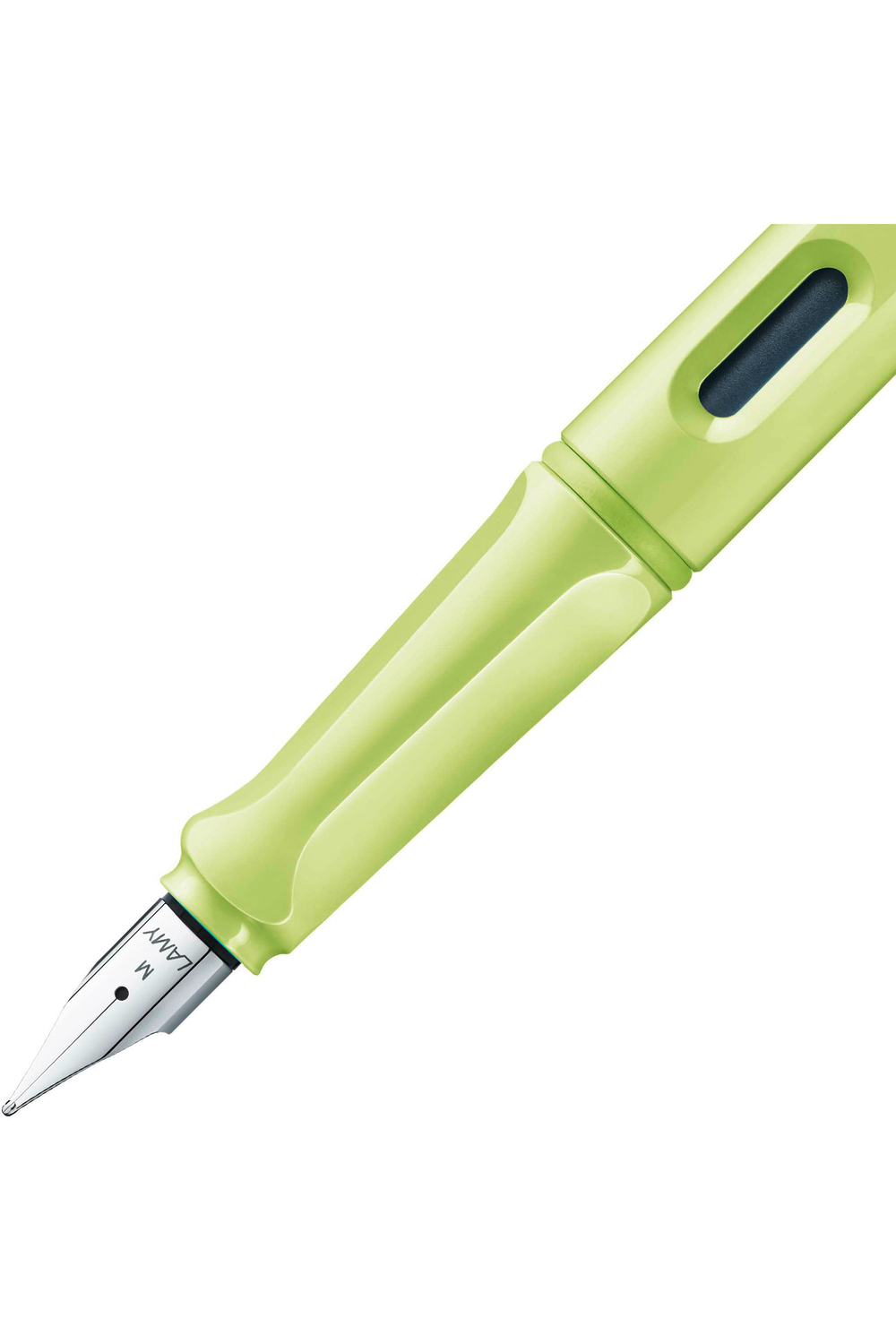 The classic safari design fountain pen in a special edition pastel green gloss, this fountain pen comes with: a polished steel nib, tough ABS plastic, triangular grip area, ink level window, strong chrome-plated brass pocket clip, and a blue Lamy T10 ink cartridge so you can get started writing right away. If you'd like to use bottled fountain pen ink, you can also purchase a LAMY Z28