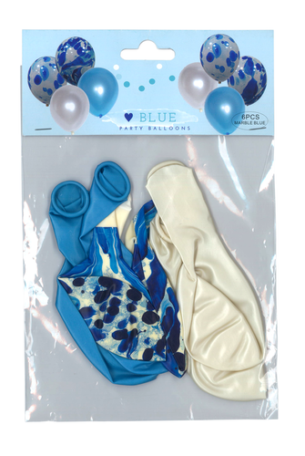 A pack of 6 helium quality latex balloons with a stunning blue marble and metallic design. These balloons are the perfect addition to any party.