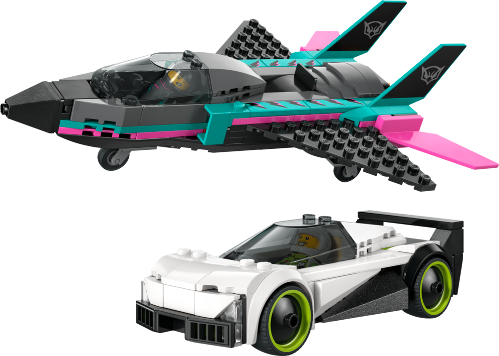 This double-feature LEGO City Jet vs. Car (60489) vehicle toy playset includes a sleek supercar and a supersonic jet for imaginative racing fun. The toy jet features swept-back wings, twin vertical fins and stabilisers. Kids can slide a lever to engage the jet's afterburners and open the cockpit of the supercar to access the detailed interior, complete with a racing seat. Just add the pilot and racing driver minifigures for hours of epic racing action. Make any day special with this jet and car building kit - a great gift for 6-year-old boys, girls and kids who love race car toys and model aircraft. Add this set to others (sold separately) from the LEGO City range for citywide action. Make this LEGO vehicles sports car and jet plane toy playset even more fun with the LEGO Builder app, where kids can zoom in, rotate models in 3D, and track their building progress.