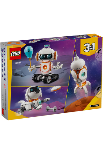 Space-loving kids can play out stories among the stars with this LEGO Creator 3in1 Space Robot (31164) building toy set. This robot toy for 8 plus year old boys and girls is set on moving tracks and features a jetpack, a body and head that can spin around, posable arms and fingers, a balloon, and a LEGO light brick that illuminates its chest. With this LEGO Creator 3in1 building set, fans build and rebuild 3 different action-packed space toys with the same set of LEGO bricks. Kids can start by building the cool toy robot, then rebuild into a posable space dog figure with a bone and a flying disc; or a space rocket toy. All 3 models are cool space-themed kids' toys for play and display and illuminate when children press down on the light brick (batteries included). This LEGO Creator 3in1 set makes a great birthday gift for 8+ year old girls and boys. With 3 different models to rebuild in every box, these 3in1 kids' building toy sets boost imaginative play and offer an impressive range that appeals to their biggest passions, including supercool vehicles, amazing animals and detailed houses. Please note that models cannot be built simultaneously.