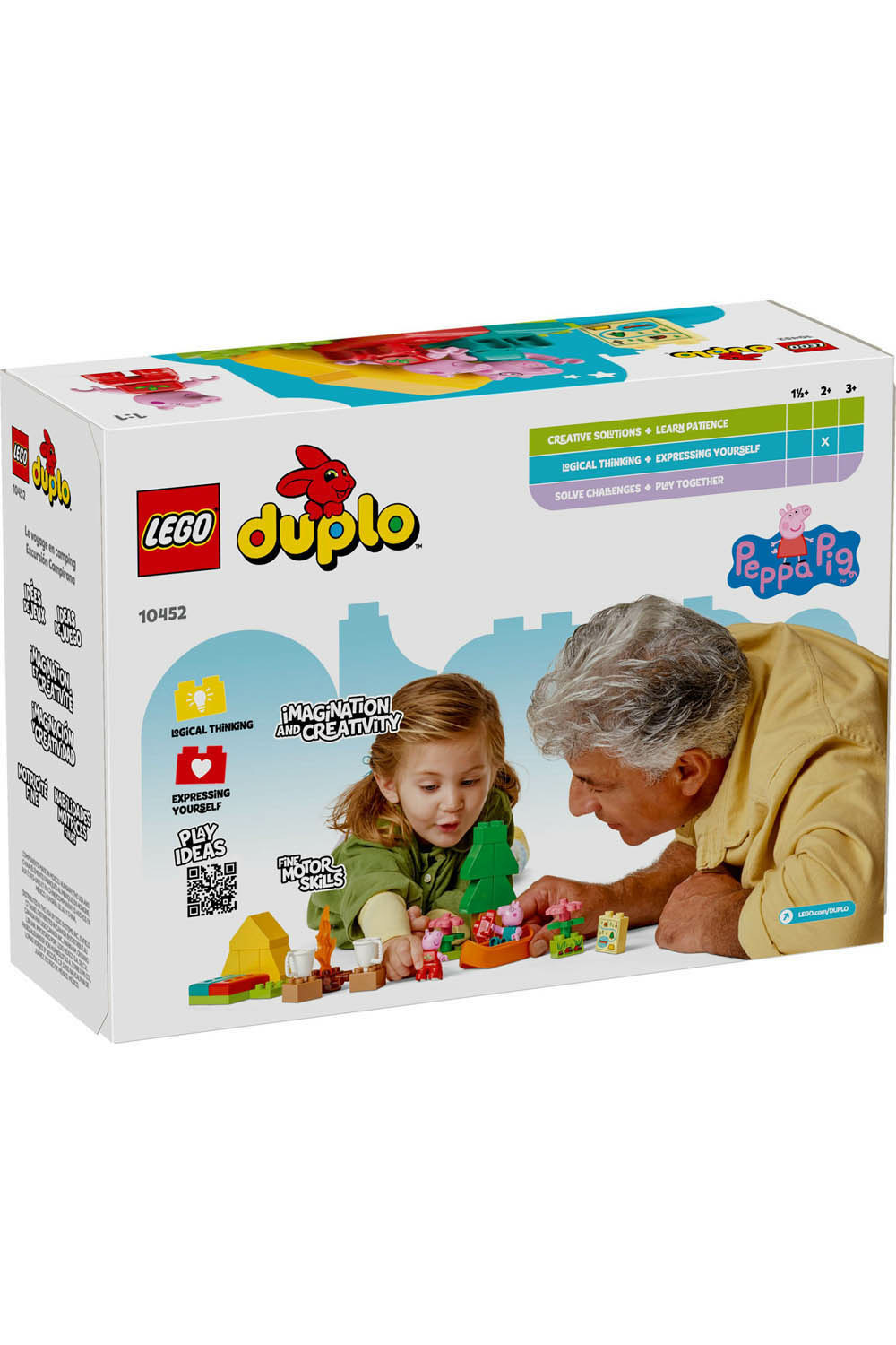 Toddlers embark on a fun adventure with the LEGO DUPLO Peppa Pig Camping Trip (10452) toddler learning toy for 2+ year old girls and boys. Through creative play, preschoolers explore how they feel about first-time experiences as they make-believe camping with Peppa Pig and Daddy Pig, then explore a river in the toy canoe. This Peppa Pig toy comes with lots of fun accessories. There's a toy tent with 2 sleeping bags, a campfire, 2 mugs and a map to encourage logical thinking as toddlers invent exciting adventures for Peppa and Daddy Pig to take in their canoe toy. Kids practice fine motor skills by using the LEGO DUPLO bricks to build the elements on the toy map. They can spend time in nature finding ladybirds, and take holiday snaps with the camera toy. This quality Peppa Pig toddler learning toy is great for Montessori, and a fun way to start talking about the emotions preschoolers might feel sleeping under canvas for the first time. These conversations also help build confidence so toddlers begin to feel they too can be as adventurous as Peppa!