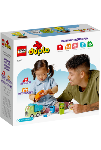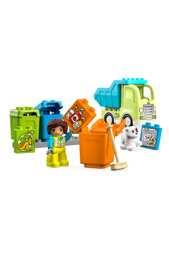 Help toddlers tidy up the town with LEGO DUPLO Town Recycling Truck 10987 toy. This realistic garbage truck toy lets curious young minds play out the world they see around them as they learn about recycling, sorting the garbage into the correct bins and dumping the trash into the truck. During the waste-sorting fun toddlers get familiar with their colours by working out which piece of trash belongs to its colour-matching sorting bins. These have hinged lids that refine motors skills as little fingers open and close them to tidy away the trash. Preschoolers will love to drive the truck and tip out its load once they reach their destination - the dump. This hands-on toy helps kids develop fine motor skills as they role-play the real-life adventures of an everyday hero who befriends a lost puppy and takes it for a ride in the truck.