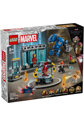 The Iron Man's Laboratory: Hall of Armor (76315) building set takes young Super Heroes and fans of Marvel Avengers movies into Iron Man's iconic lab. Packed with LEGO Marvel figures and cool features to inspire imaginative adventures, this kids' build-play-and-display set is an ideal gift for boys and girls aged 8 and up. The buildable LEGO # Marvel toy features 3 armor pods and 3 Iron Man armour minifigures: the Iron Patriot, MK43 and MK6. The lineup is completed by Pepper Potts and the villain Aldrich Killian minifigures, a buildable Dum-E robot and a large, Igor Iron Man MK3 mech with movable arms and legs and a cockpit with room for a minifigure. Other features include a maintenance platform with 2 robotic-style arms and a large scanning device. There's also a fire extinguisher and 2 fire elements and 2 stud shooters for when the battle action begins. For added digital fun, builders can zoom in, rotate models in 3D and track their progress using the fun, intuitive LEGO Builder app.