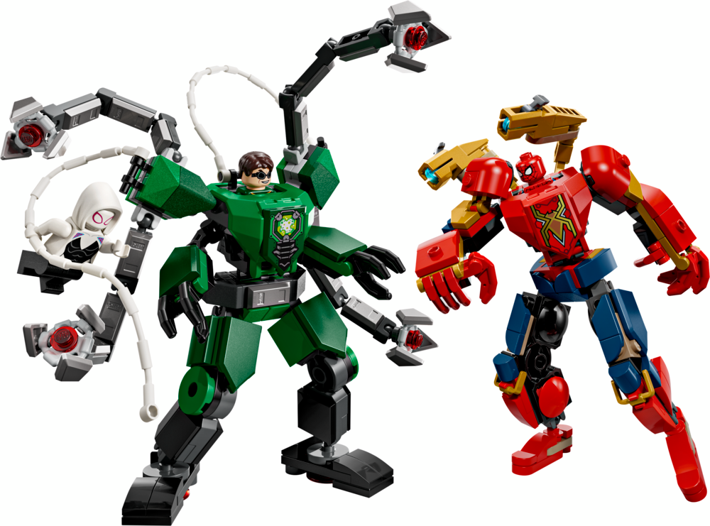 Join 2 fully jointed mechs for supersized Super Hero action with Mech Battle: Spider-Man vs. Doc Ock (76338), a building toy gift for boys and girls aged 6 years old and over. Kids can position and pose the 2 mechs to bring imaginative adventures to life along with Spider-Man, Ghost-Spider and Doc Ock LEGO Marvel minifigures. Both mechs are highly articulated for maximum dynamic action and have an opening cockpit that holds a minifigure pilot. The Spider-Man Mech is in the Iron Spider style and features 2 movable, button-operated stud shooters. The Doc Ock Mech is equipped with 4 fully articulated tentacles. There are also 2 web ropes that easily attach to mechs and minifigures, and Ghost-Spider has slings that can attach to the Doc Ock mech torso. This LEGO Marvel Spider-Man merch makes a great gift and, with the LEGO Builder app, kids can build with confidence as they zoom, rotate in 3D and track progress with digital instructions.