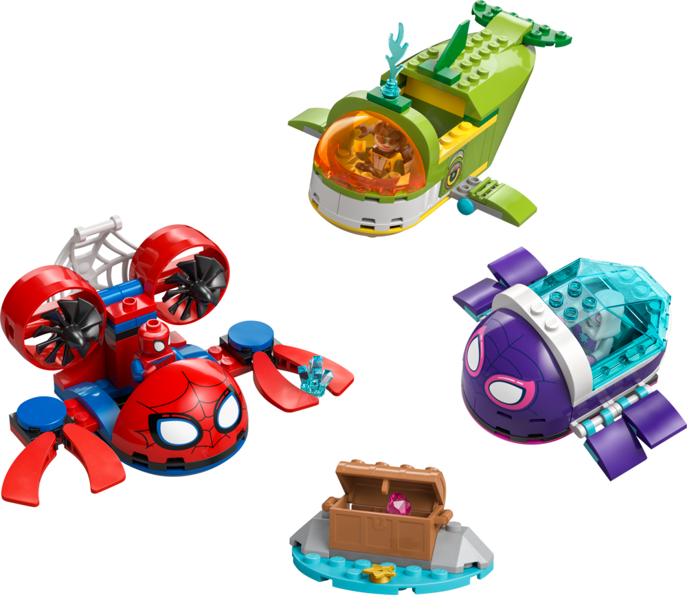 Zoom into pretend-play adventures with Spidey: Underwater Vehicles (11207), a building set for boys, girls and LEGO Marvel fans aged 4 years old and over. With Spidey, Ghost-Spider and Doc Ock minifigures and 3 submarines, this build-and-play Spidey playset is a great way to develop kids' creative skills. The building toy features 3 vehicles: Spidey's crab submarine with a large web trap; Ghost-Spider's turtle submarine with an opening transparent shell; and Doc Ock's whale submarine with shooters on the fins and storage space for the treasure chest. Spidey: Underwater Vehicles makes a great birthday gift for fans of the Spidey And His Amazing Friends show. Designed with budding builders in mind, it includes colourful pictorial instructions, large Starter Bricks and separate bags containing 1 buildable model per bag to make construction fast and fun. With the LEGO Builder app, kids can zoom, rotate in 3D and track progress with easy-to-follow digital instructions.