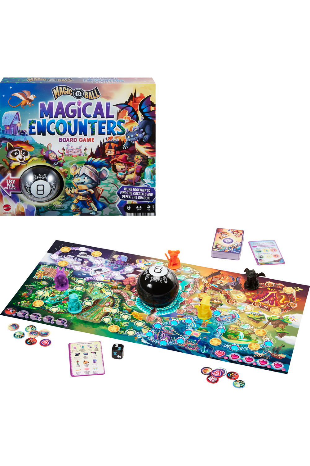 Welcome to Magical Encounters! With the Magic 8-Ball as your guide, embark on an epic adventure! The object of the game is to work as a team to collect four crystals around the board and bring them to the towers. But you need to watch out! Gadworm the dragon will hover over the castle to catch you! Work together as a team and Magic 8 ball will guide you throughout your journey. On your turn, you roll a die that will give you two numbers; one for your movement and one for the dragon. After you move first, you either pick up the star token that could be a crystal or a useful item along the way or get the encounter! Encounter cards will give you the situation and two options you can choose for your action. After you make the decision, it's time to consult the Magic 8-Ball! Based on what answer you get from the Magic 8-Ball, you will face different results. At the end of your turn, don't forget to move Gadworm the dragon based on your dice roll.