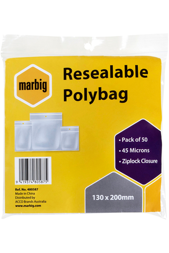 Marbig Resealable Polybags 130mm x 200mm Pack of 50