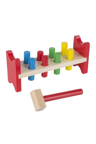 Pound the eight colorful wooden pegs into the wooden bench, then flip it over to repeat the activity again and again! Four pairs of pegs for color matching and wooden hammer included.