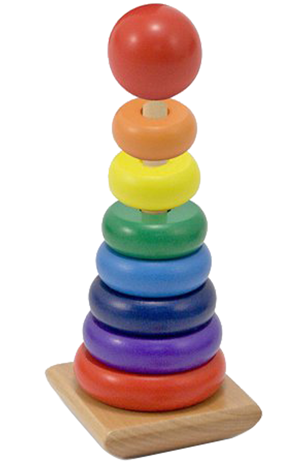 A Melissa & Doug Rainbow Stacker toy. Little children will love this classic stacking game, with brillantly coloured wooden pieces that are built to last. All the colors of the rainbow are represented by these eight smooth, easy-grasp wooden pieces. Stack them on the solid-wood base, designed with rocking edges for safe and intriguing play.