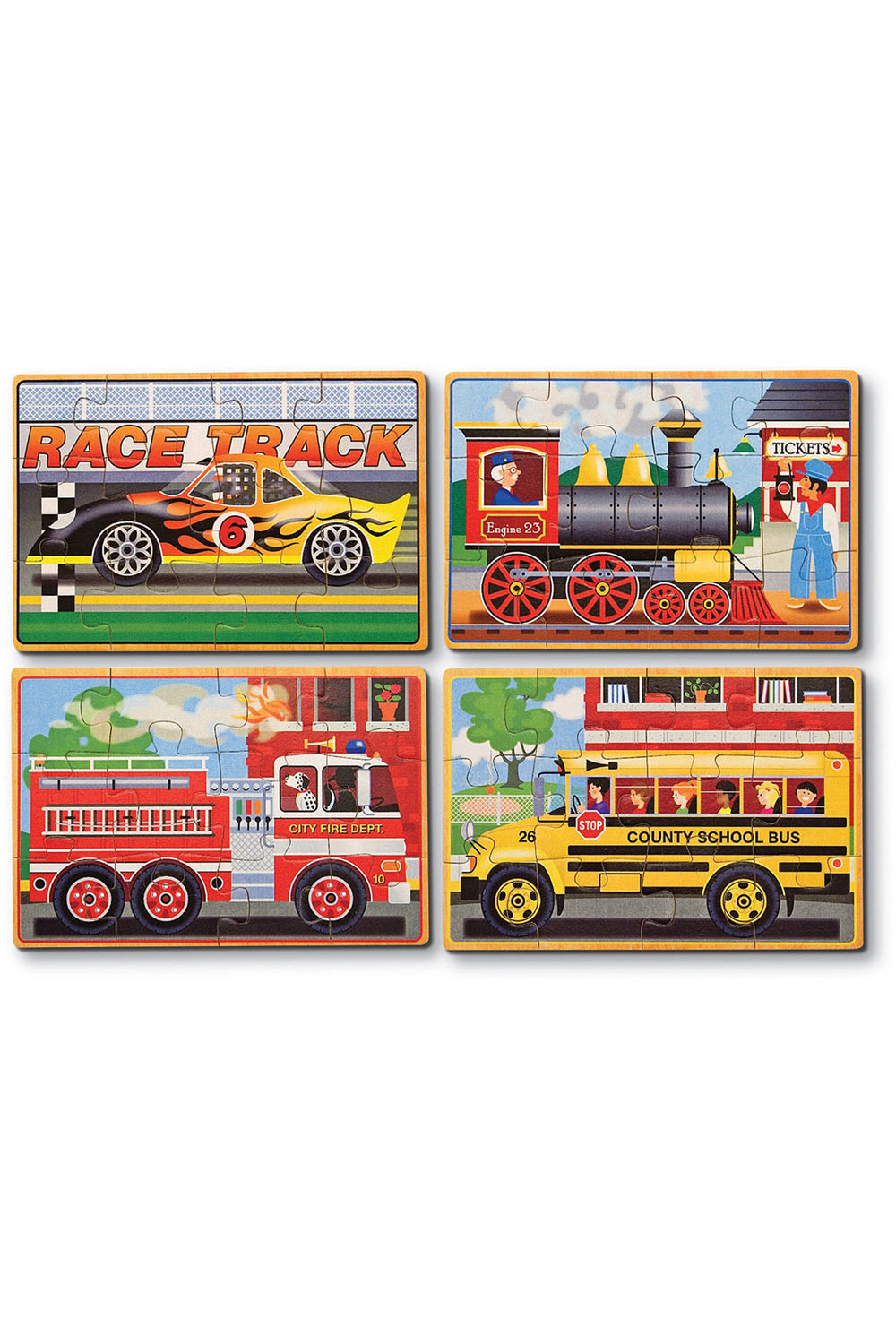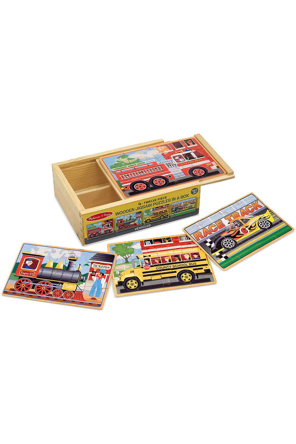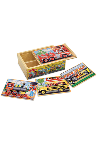 This Melissa & Doug Puzzle in a Box set includes 4 12 piece puzzles, all of different vehicles so you can choose what you'd like to put together. Each puzzle is stored in a separate compartment of the box to prevent mixing the pieces up. Plus, the slide-on box lid doubles as a convenient puzzle board and the pieces are colour coded for easy sorting. It's a great option for when you're travelling. It helps to teach hand-eye coordination and enhances creativity. This set includes 4 puzzles of 4 vehicles including a race car, steam engine, school bus and a fire engine.
